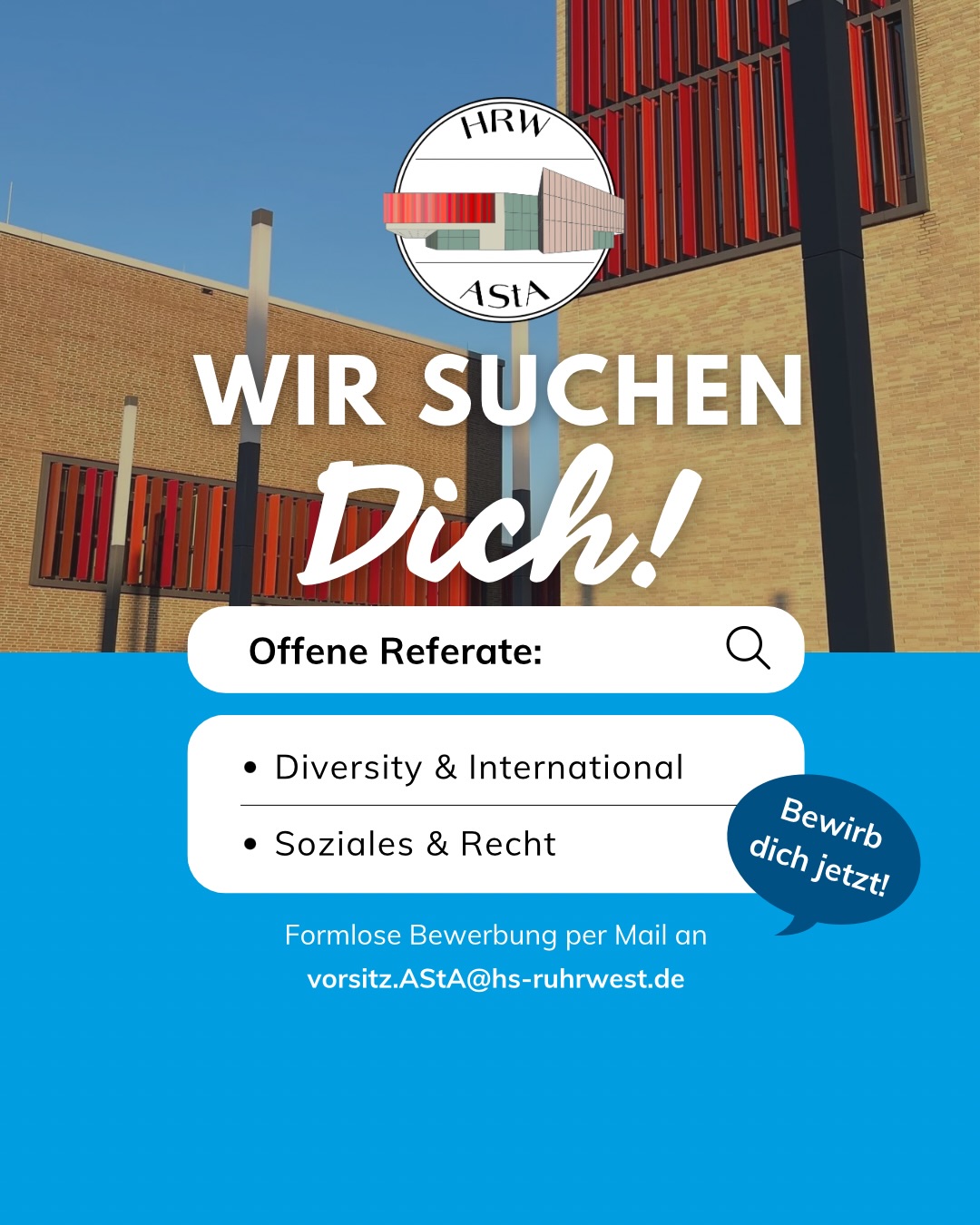 Der Allgemeine Studierendenausschuss (AStA) der Hochschule Ruhr West organisiert und veranstaltet verschiedene Events und Aktivitäten für die Studierenden. Wir sind ein Team von 17 Studierenden, die sich ehrenamtlich für euch und euer Wohlbefinden einsetzen. Wir sind engagiert, ein lebendiges und bereicherndes Leben auf dem Campus zu fördern und bieten den Studierenden zahlreiche Möglichkeiten, sich außerhalb des Unterrichts zu engagieren. Unser Ziel ist es, eine positive